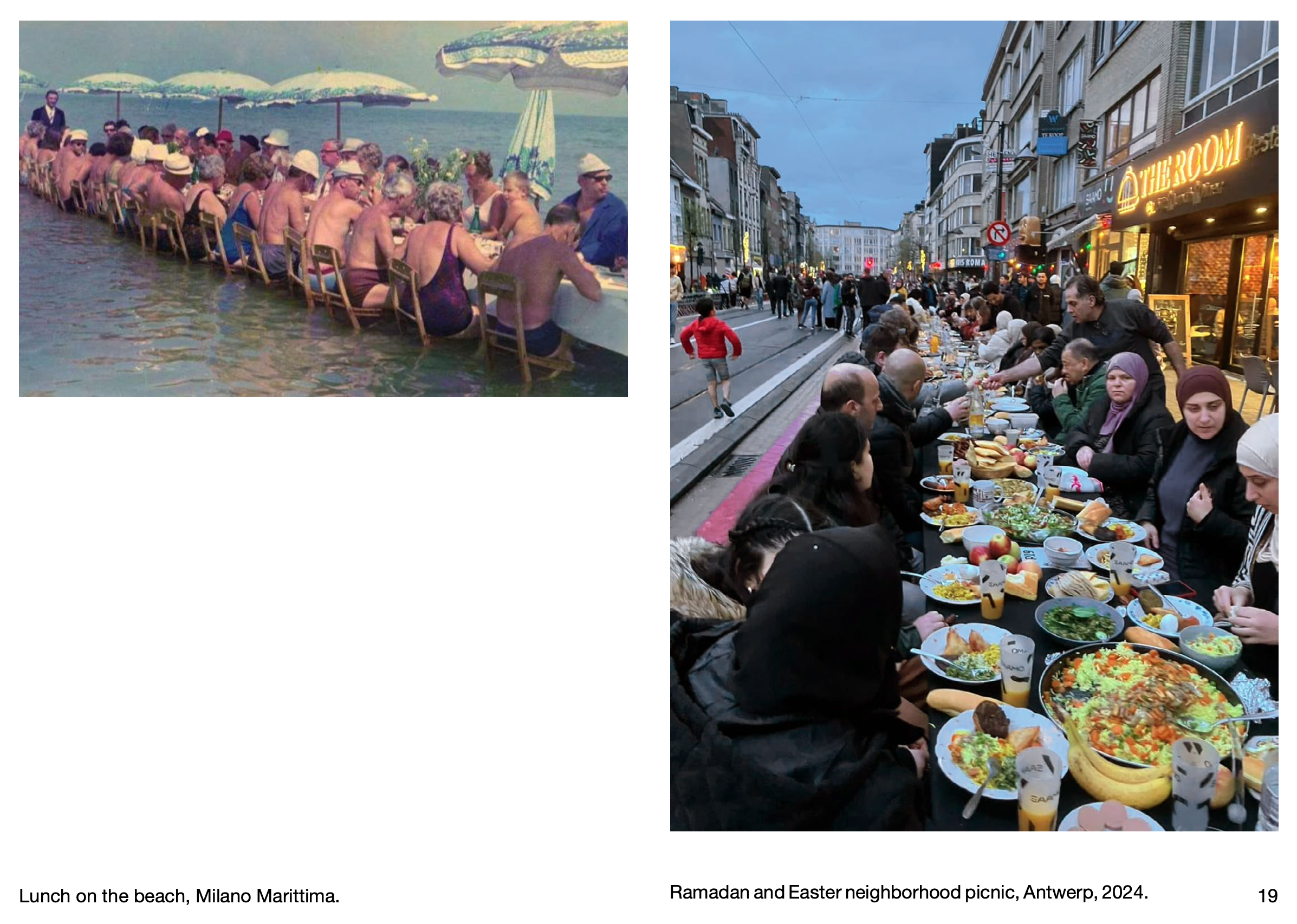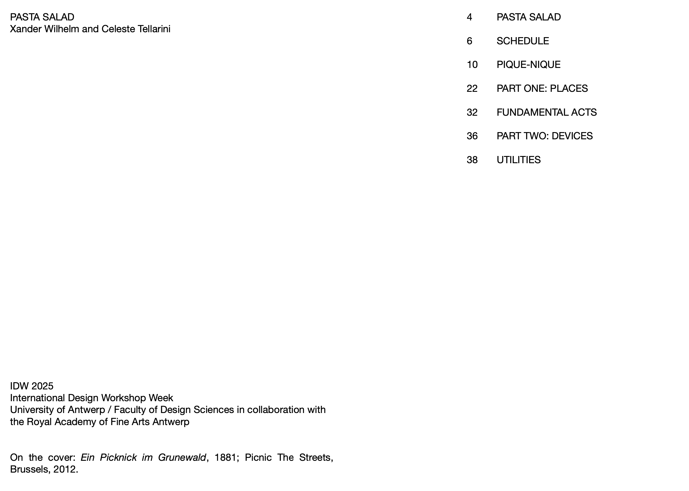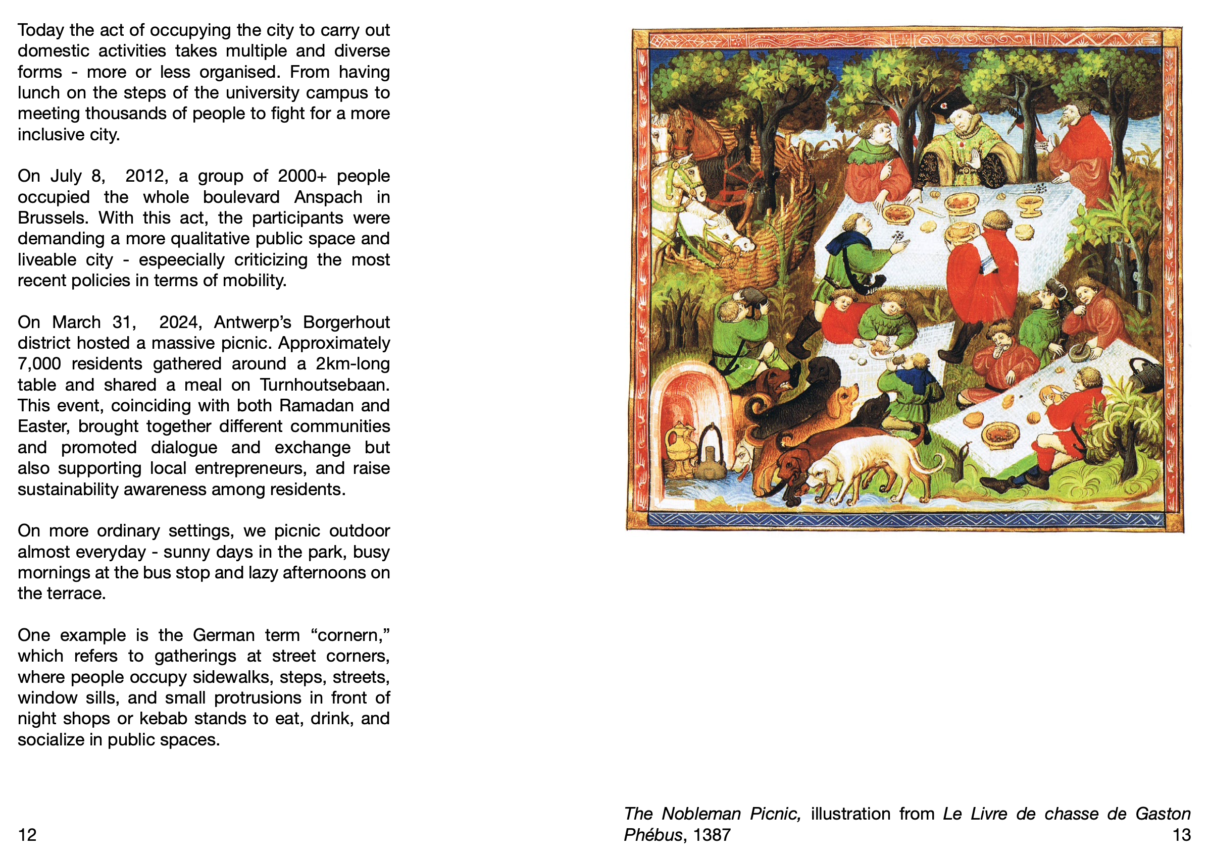 In an era of food delivery and individuality, we propose a journey back to the primary act of sharing a meal. We aim to reimagine the picnic as an act of coming together and celebrating our shared spaces, where the preparatory work necessary to the final event is as crucial as the event itself. Planning, coordinating, discussing, solving and inventing are in fact already part of the ritual.