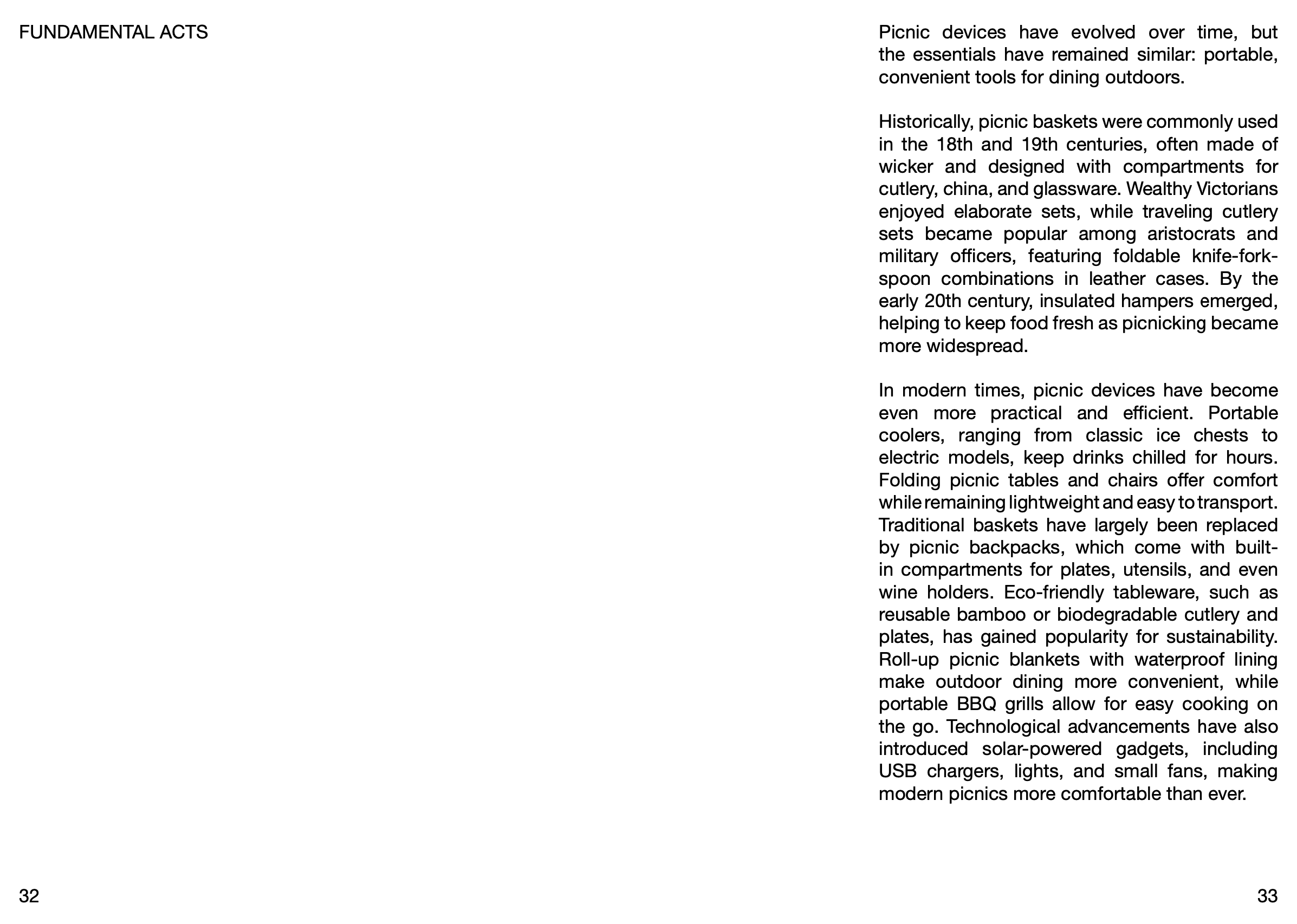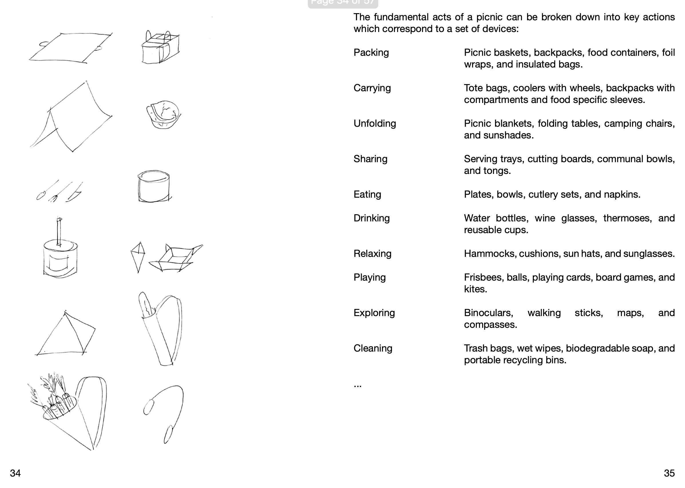 The picnic serves as our canvas. It represents a low-threshold, accessible way to break free from our domestic routines and engage with each other, experiment with other ways of performing ordinary actions and take a break from the hectic everyday obligations. The workshop will explore the art and science of picnicking, viewing it through the lens of design. We will start by evaluating the specificcharacteristics of mobile dining equipment, how it differs from our everyday household objects and experiences.